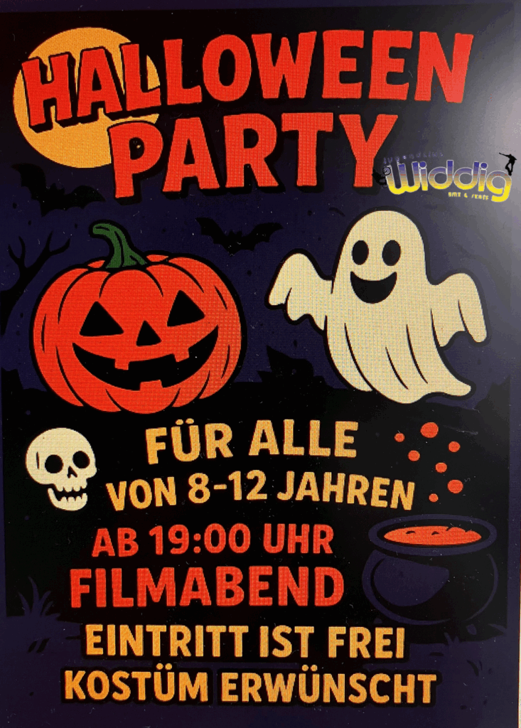 Am 31.10.2025 sind alle Kinder und Jugendlichen herzlich zur diesjährigen Halloween Party im Jugendclub Widdig eingeladen.