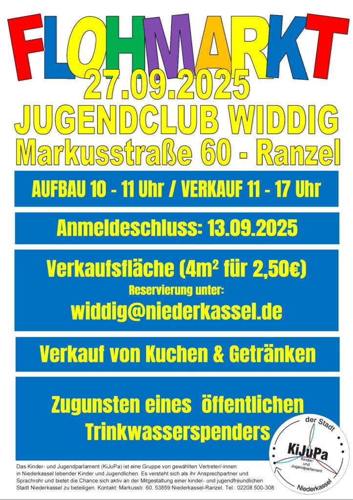 Wir, das Kinder- und Jugendparlament der Stadt Niederkassel, laden euch ganz herzlich zu unserem Flohmarkt am 27.09.2025 ein!