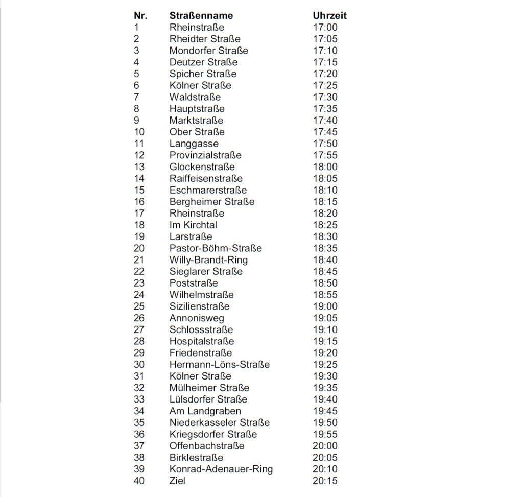 Rheinstraße 85s – Rheinstraße – Rheidter Straße – Mondorfer Straße – Deutzer Straße –Hauptstraße – Spicher Straße – Kölner Straße – Waldstraße – Hauptstraße – Deutzer Straße– Marktstraße – Oberstraße – Langgasse – Pastor-Breuer-Straße – Provinzialstraße –Rheinstraße – Glockenstraße – Mondorfer Straße – Zum Kalkofen – Raiffeisenstraße – Eschmarer Straße – Bergheimer Straße – Rheinstraße – Im Kirchtal – Larstraße –Rathausstraße – Spicher Straße – Pastor-Böhm-Straße – Larstraße – Sieglarer Straße – Poststraße – Wilhelmstraße – Sizilienstraße Cecilienstraße – Annonisweg – Schloßstraße – Hospitalstraße – Friedensstraße – Kronenstraße – Hermann-Löns-Straße – Kölner Straße – Mülheimer Straße – Hauptstraße – Lülsdorfer Straße – Am Landgraben – Niederkasseler Straße – Kriegsdorfer Straße – Offenbachstraße – Birklestraße – Kriegsdorfer Straße – Konrad-Adenauer-Ring – Rheinstraße 85s.