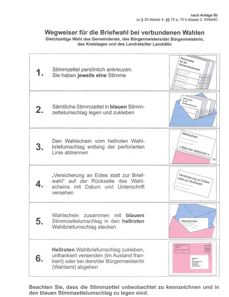 Entgegen dem den Briefwahlunterlagen beigefügten Muster-Wegweiser sind lediglich drei Stimmzettel von den Wahlberechtigten auszufüllen.